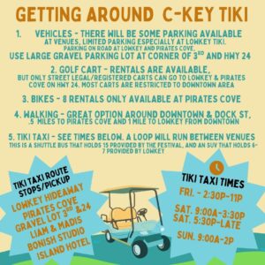 The Tiki Shuttle will run from morning to late, with intermittent breaks during the Mainstage times, 11am-6p. where it will be parked at Pirates Cove.